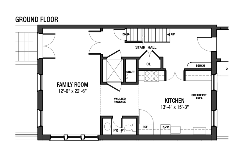 The vaulted passage that separates the kitchen from the family room contains a powder room and access to the elevator. The stair hall also opens through French doors to the family room, a large room with windows facing south to State Street and west to the private garden. A second set of French doors, directly opposite the set from the stair hall, opens directly to the landscaped garden with bluestone paving and a private off-street parking space. The two facing sets of French doors provide abundant natural light to both the family room and the stair hall.
