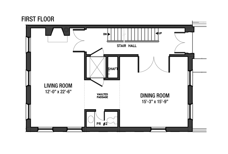 Parlor Floor: Living Room and Formal Dining Room The main entry to the home is found at the parlor floor level. This main entry opens to the stair hall foyer. Directly to the left, through French doors, is the traditional, beautifully proportioned formal dining room with two windows looking east over Hicks Street and a third south over State Street.