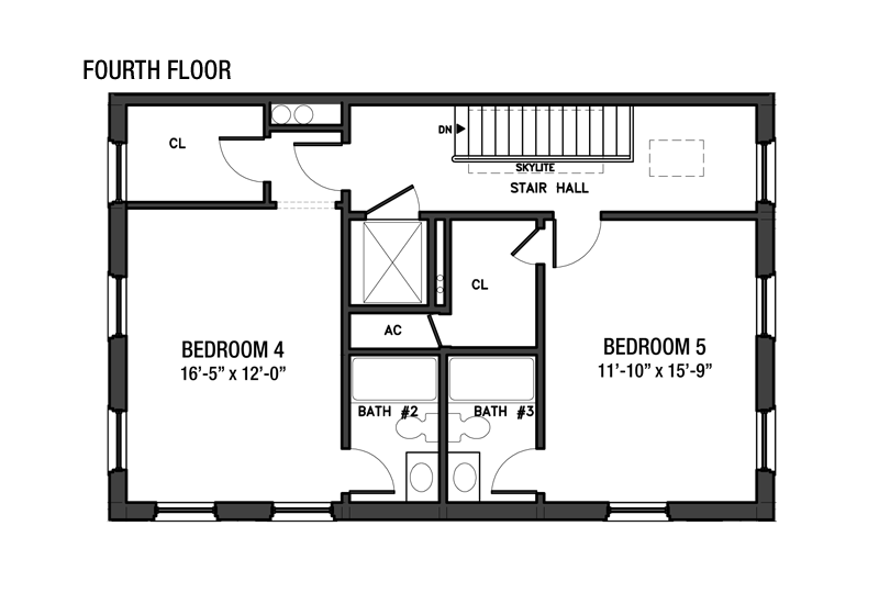 Fourth Floor: Fourth and Fifth Bedrooms The fourth floor contains the fourth and fifth bedrooms, one facing east to Hicks Street and the other west overlooking the garden. Each bedroom has a very generous walk-in closet and an en suite bathroom with ceramic tile floor, wood vanity, and white Carrera marble countertop. This top floor features sky lights above the stairway that bring in additional natural light.