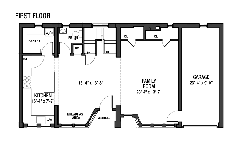 First Floor: Kitchen and Family Room This main entry level contains an expansive chef’s kitchen complete with large breakfast area and separate pantry/laundry room at one end of the open floor layout and a family room at the other end.