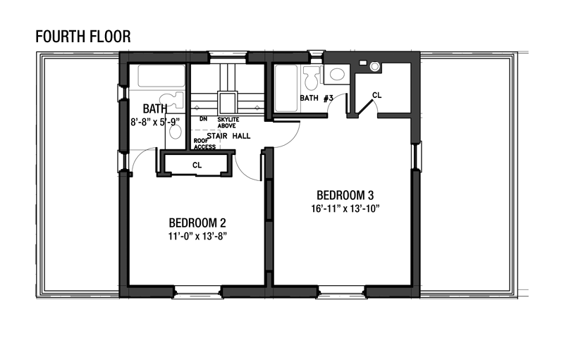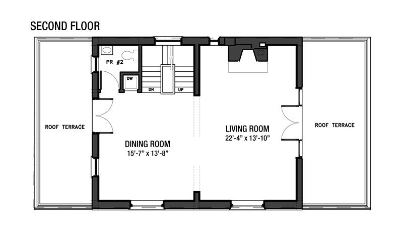 Second Floor: Living and Dining Rooms Two large terraces created at opposite ends of the dramatic second floor accentuate the open design of this spacious living/dining floor and further enhance the rooms’ natural flow of air and light. The living room and dining room each open to terraces (finished in blue stone) through classic French doors. The living room also features a wood-burning fireplace framed by a handsome wood mantle. The dumbwaiter between the kitchen and the second floor makes easy work of serving food in the dining room or on the terrace. This floor also contains a powder room off the dining room.